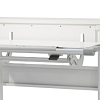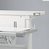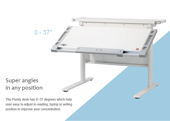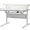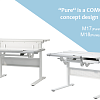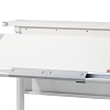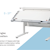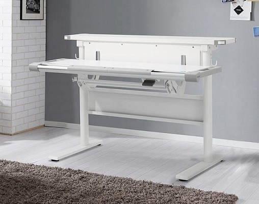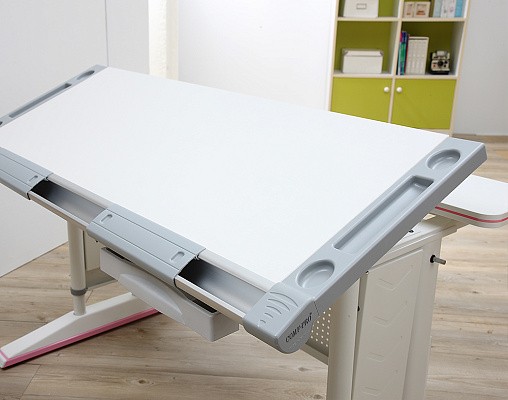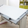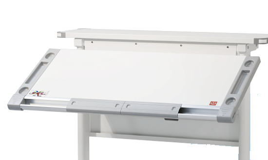 Основная столешница изменяет высоту относительно неподвижного основания парты с помощью специального надежного механизма. Этот механизм позволяет легко и быстро изменять высоту столешницы не только взрослому, но и ребенку. За этой партой можно заниматься даже стоя. А заднюю статичную часть можно использовать для размещения книг, установки держателей экрана компьютера или книжных полок.