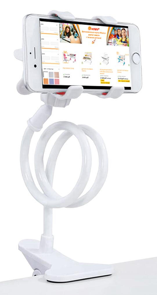 Держатель для телефона - важный аксессуар на письменном столе современного школьника. Зажим держателя оснащен мягкими накладками, которые крепко и надежно фиксируют телефон. Гибкая рукоятка позволяет регулировать высоту, а роликовая направляющая позволяет вращать телефон на 360 градусов. Держатель фиксируется на столешнице с помощью прищепки.