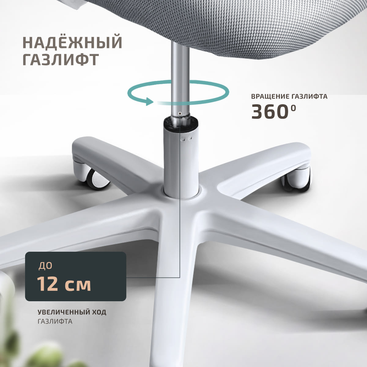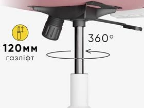 Установлен газлифт 3-го класса, что позволяет плавно менять высоту кресла в диапазоне 120 мм. Этот компонент обеспечивает полный оборот 360 градусов и надежно выдерживает вес до 100 кг без расшатывания