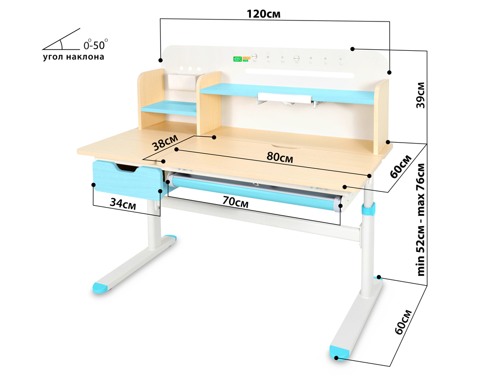 Регулировка высоты столешницы 52-76 см. Высота стола регулируется с помощью механической ручки, что дает возможность легко настроить парту под рост ребенка. Стол с трансформирующейся столешницей, которая изменяет угол наклона до 50 градусов с помощью механизма газлифт. Вы можете установить оптимальный угол наклона столешницы для чтения, письма или рисования.