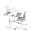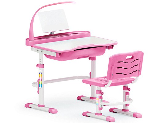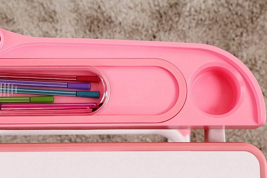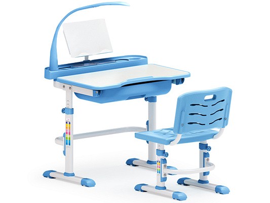 Прочная матовая столешница из МДФ дополнительно оснащена пластиковой полочкой, которая включает в себя пенал для карандашей, лампу, подстаканник и подставку для книг. Также столешница может изменять угол наклона. Покрытие столешницы устойчиво к механическим повреждениям и не отражает солнечные блики. Чтобы поддерживать стол в чистоте, достаточно протереть влажной тканевой салфеткой.
