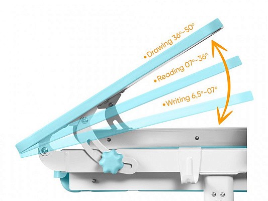 Столешница меняет угол наклона до 50 градусов и фиксируется винтами. Столешницу можно использовать не только для письма и чтения, но и как мольберт.