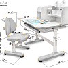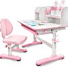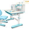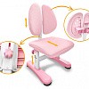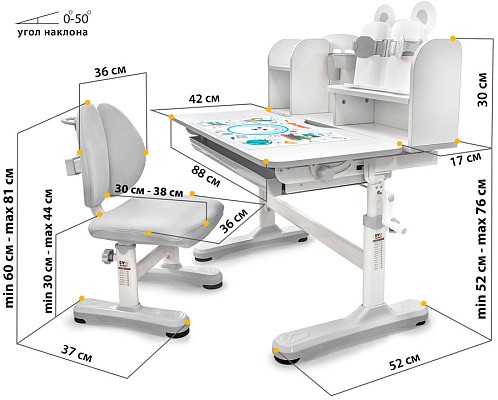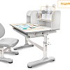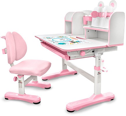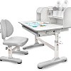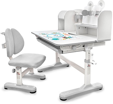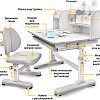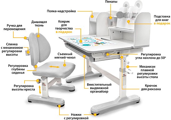 Главной особенностью комплекта является растущее кресло с двойной ортопедической спинкой и мягким съемным сиденьем, обтянутым мебельной дышащей тканью. Кресло регулируется по высоте и глубине специальными винтами. Максимальная нагрузка - 60 кг. На каркасе крепится ручка для удобного перемещения кресла по комнате.