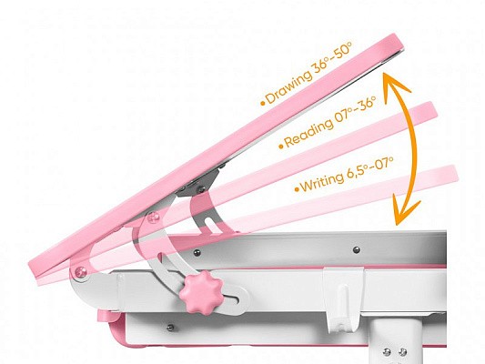 Столешница меняет угол наклона до 50 градусов и фиксируется винтами. Столешницу можно использовать не только для письма и чтения, но и как мольберт.