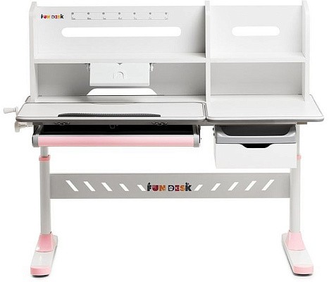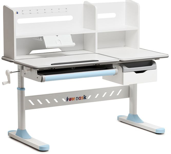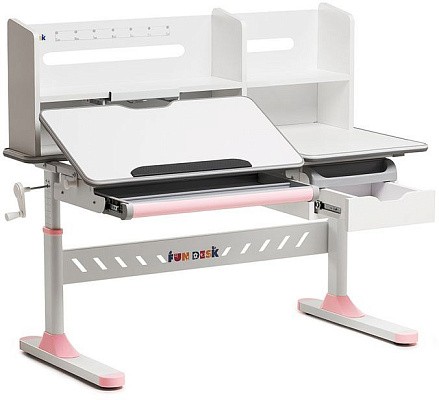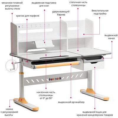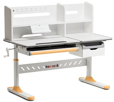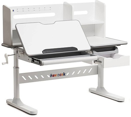«ФанДеск» могут регулировать высоту парты под рост ребенка, а столешница может изменять угол наклона. Каждую модель можно оборудовать дополнительными аксессуарами. Парта «FunDesk» имеет множество ящиков для хранения канцелярских принадлежностей и тетрадей.