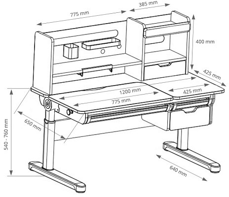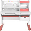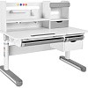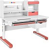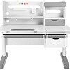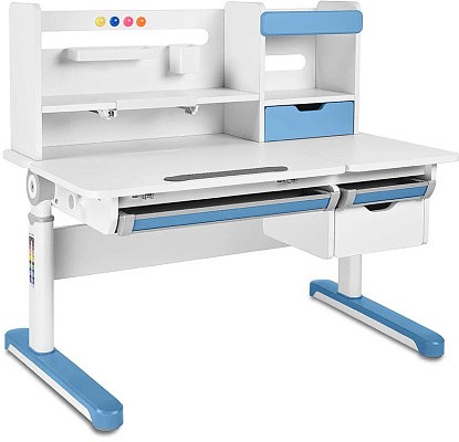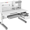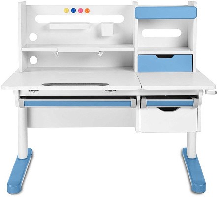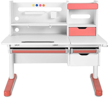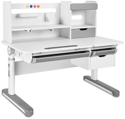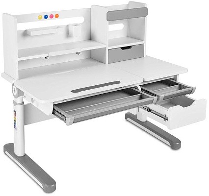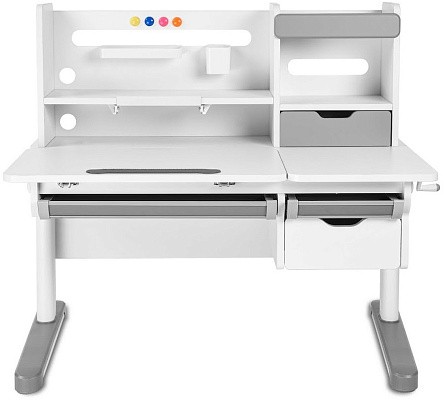 FunDesk Sentire является удлиненной на десять сантиметров версией парты Pensare. Также как и младшая версия имеет вместительную надстройку с тремя полками, выдвижным ящиком, подставкой для книг, и перфорацией для крепления дополнительных аксессуаров. Под разделенной на две зоны столешницей, располагаются еще три выдвижных ящика, два из которых имеют разделение внутреннего пространства на секции, для более комфортного хранения вещей. Для безопасности ребенка все углы парты закруглены, а на механизме регулировки высоты и ножках присутствуют пластиковые накладки, что помимо защиты, также выполняют декоративную роль.