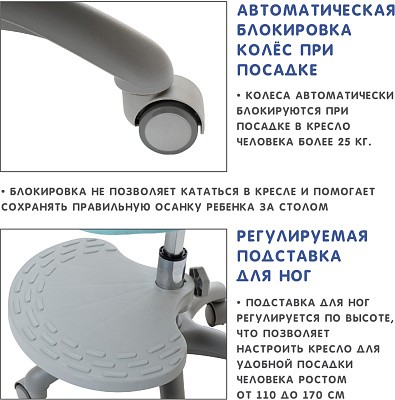 Растущее кресло Holto-15 подходит как для растущих парт, так и для обычных столов. Регулировка высоты кресла и глубины сиденья позволят подобрать наиболее удобное положение для Вашего ребенка, которое сохранит осанку в правильном положении во время занятий, а регулируемая подставка для ног обеспечит их положение под углом 90 градусов. Кресло подойдет для школьников ростом от 110 до 170 см. Колеса блокируются при посадке человека выше 20 кг.