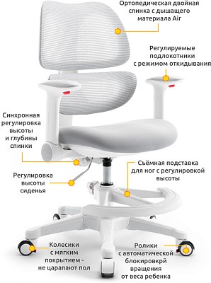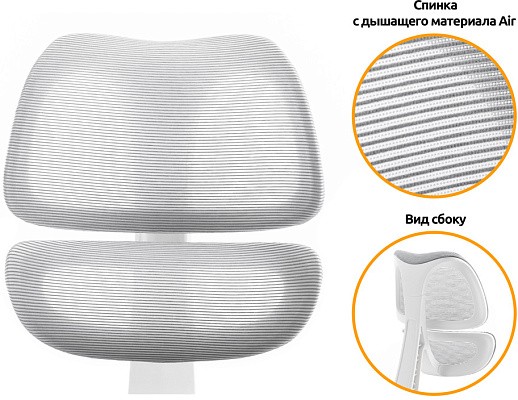 Ортопедическая спинка из дышащего материала Air разделена на две части, что позволяет лучше поддерживать поясницу во время занятий и правильно распределить нагрузку спины.