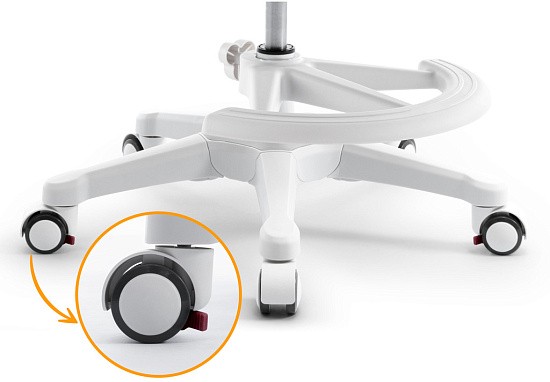 Регулируемая подставка для ног из прочного и безопасного пластика снимается за ненадобностью Колесики с мягким покрытием плавно скользят по поверхности пола. Передвижение кресла автоматически блокируется при нагрузке от 25 кг. Блокировку колес можно отключить специальными стопорами.
