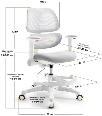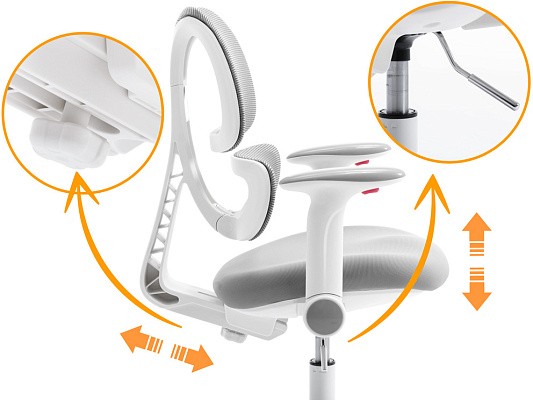 У кресла синхронная регулировка высоты спинки и глубины сидения, которая регулируется винтом. Плавную регулировку высоты кресла обеспечивает качественный газлифт. Возможность регулирования и наличие подставки позволяет использовать кресло со стандартными нерегулируемыми столами.