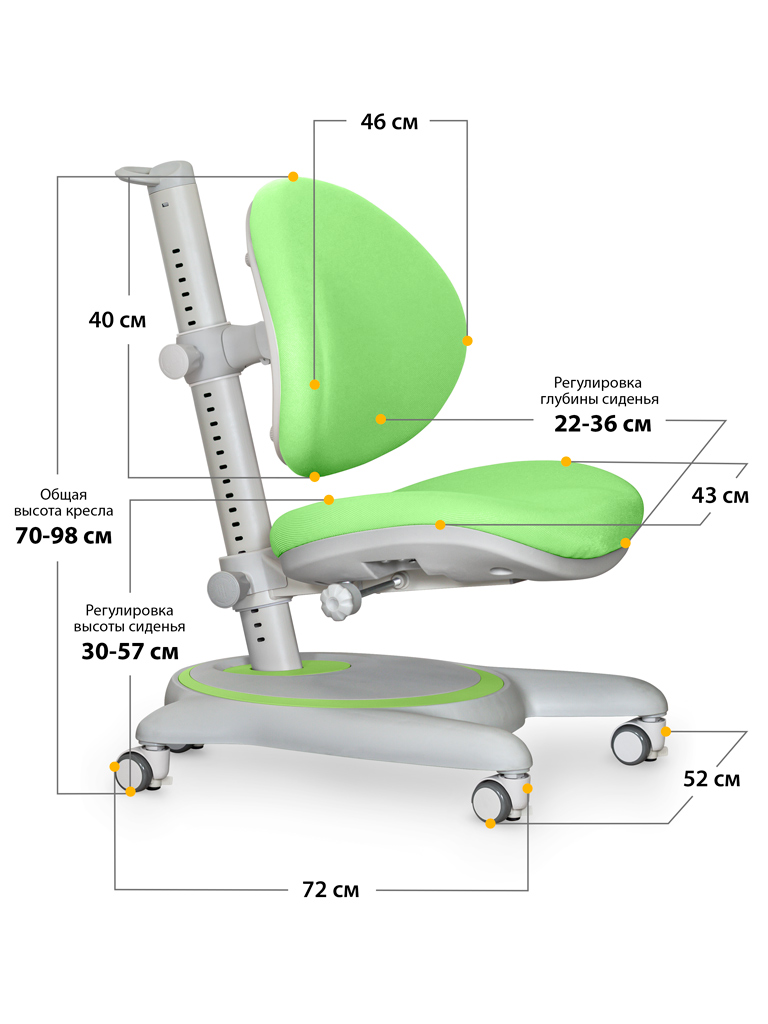 У кресла независимая регулировка высоты спинки и сиденья. Регулировка осуществяется с помощью специальных винтов на металлической несущей трубе Глубина сиденья регулируется ручкой -фиксатором. Кресло подойдет для детей от 3х лет до взрослого возраста