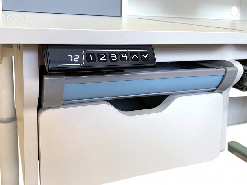 Для регулировки высоты парты используется электропривод. Благодаря ему изменить высоту парты с легкостью сможет даже ребенок. Вы можете запомнить четыре наиболее часто используемых значений высоты парты для более простого управления.