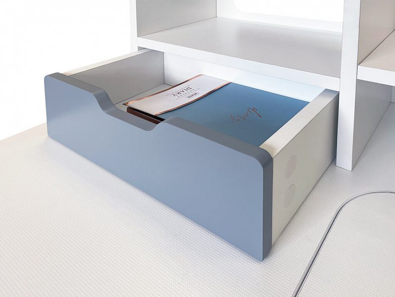 Вместительный выдвижной органайзер расположен под столешницей. В нем удобно хранить ручки и тетрадки, которыми ребенок пользуется наиболее часто.