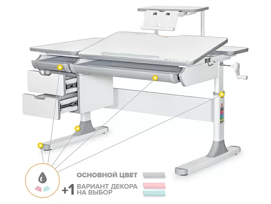 Одной из важных особенностей данной модели является наличие сменных цветных накладок в подарок! Приобретайте комплектацию стола Lite или с полкой BD S-50 в сером цвете и получите розовые либо голубые накладки совершенно бесплатно! Накладки меняются на ножках, пластиковом пенале и выдвижном органайзере.