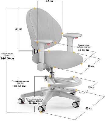 Под сиденьем расположен винт для регулировки глубины кресла, поэтому можно с легкостью подстроить кресло под параметры ребенка. Глубина кресла и высота спинки регулируются синхронно. Высота всего кресла регулируется механизмом газлифт.