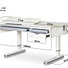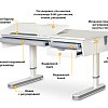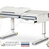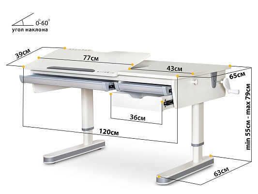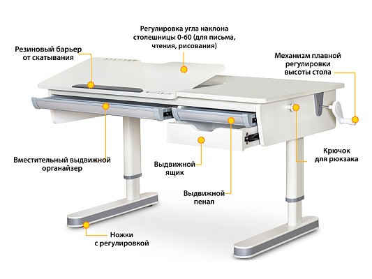 Рабочая часть столешницы меняет угол наклона до 60 градусов с помощью специального газлифта.. На столешнице есть зазор для безопасного процесса регулировки, с которым справится даже ребенок. Угол наклона меняется ступенчато и можно очень просто подобрать положение для чтения, письма, рисования.