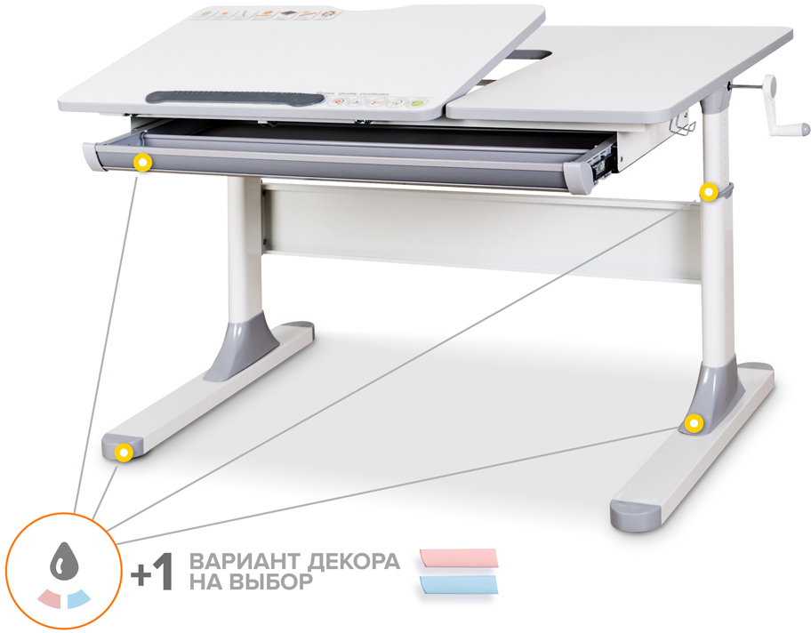 Подвижная часть столешницы меняет свой угол наклона с помощью специального газлифта. Одно плавное нажатие и вы трансформируете рабочую зону для письма и чтения, а благодаря большому углу наклона (до 60 градусов) столешницу можно использовать для рисования, как мольберт. Чтобы ребенок не травмировался, когда самостоятельно будет менять угол наклона, на столешнице есть безопасный зазор.