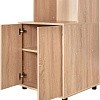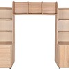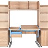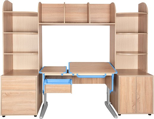 Комплект состоит из двух стеллажей с закругленными полками и двух вместительных тумб. Одна из тумб с ящиками, вторая - с распашными дверцами. Ящики и дверцы открываются простым нажатием на них. Навесная полка крепится между стеллажей. Комплект отлично впишется в интерьер любой комнаты, не только детской. Школьные принадлежности, канцелярия и аксессуары разместятся внутри ящиков.