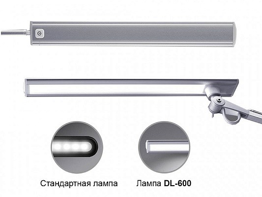 LED-лампа DL-600 представляет собой прочный алюминиевый корпус, светодиоды, которые не мерцают, не бликуют на поверхности, препятствуют напряжению глаз, а также имеют высокий показатель энергоэффективности.